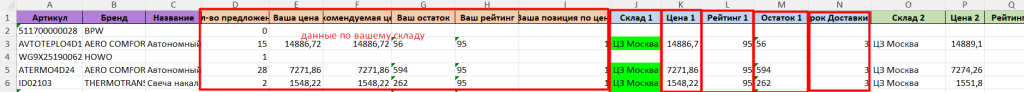 На данном примере показан вариант сбора парсером данных по 5ти ближайшим складам конкурентам(отфильтровываются по самой низкой цене, количество может меняться по желанию): вначале представлена информация по вашему складу. Далее собраны данные по складам конкурентам: название, цена, рейтинг, остатки, сроки доставки.