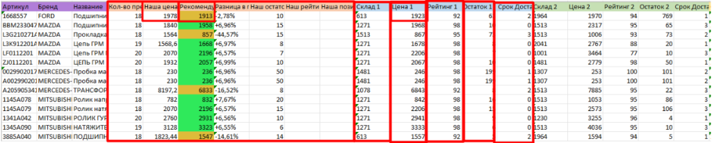 В первых выделенных столбцах показаны данные по складу заказчика: количество предложений, цена, рекомендуемая цена(от первого ближайшего конкурента минус процент, который вы устанавливаете), разница в процентах, остатки, рейтинг, позиция по цене.