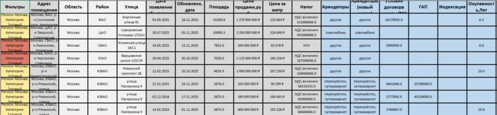 В выделенных столбцах по желанию заказчика парсер может подтянуть данные из описания: арендаторы, условия договора, ГАП(годовой арендный платеж), индексация и окупаемость.