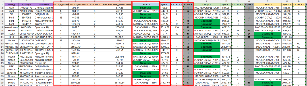 В первых 4х выделенных столбцах парсер подтянул данные по складу заказчика: количество предложений, цена и рекомендуемая цена, позиция по цене. Рекомендуемая цена высчитывается от ближайшего склада конкурента минус процент, который вы сами устанавливаете(если склад заказчика находится на первом месте, то от второго соответственно и т.д., при этом он будет выделен зеленым цветом).