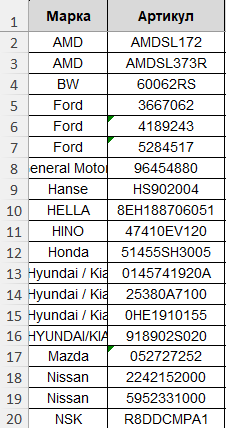 Важно. Название артикула и бренда должны соответствовать написанию на сайте.