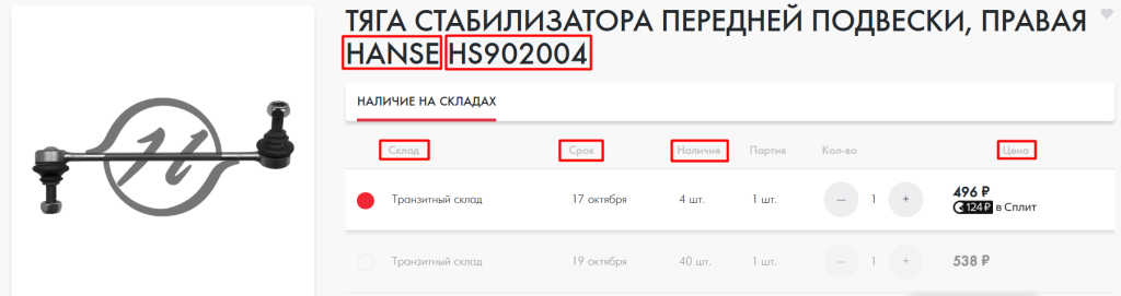 На изображении ниже показано, какие данные собирает парсер с сайта: производитель, артикул, склад, сроки поставки, остатки, цена и др.