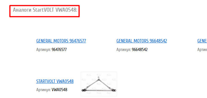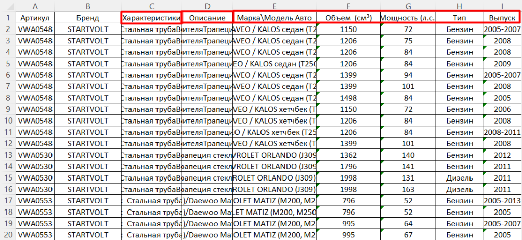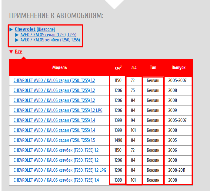Также парсер находит информацию по применению товаров к автомобилям: модель, объем, тип, выпуск и др.
