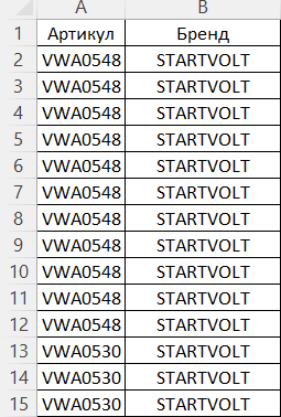 В первые два столбца вносим необходимые данные по артикулам и брендам.