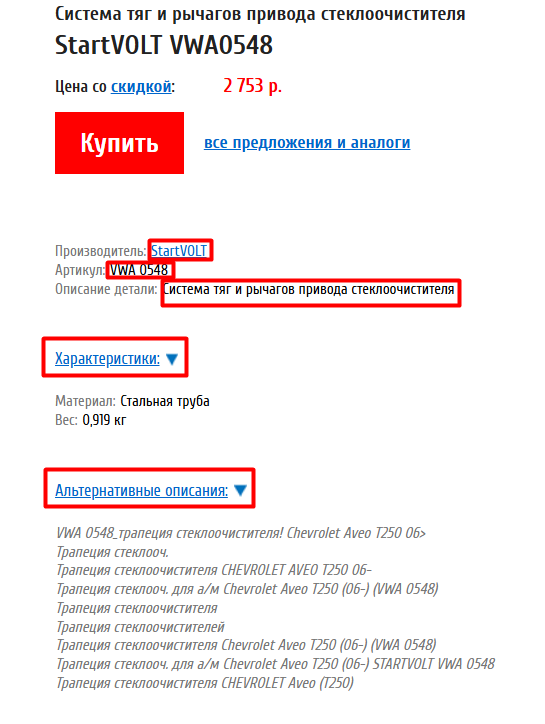 На изображениях ниже показаны, какие данные парсер собирает с сайта Port3.ru: производитель, артикул, описание детали, характеристики(материал, вес), альтернативные характеристики.